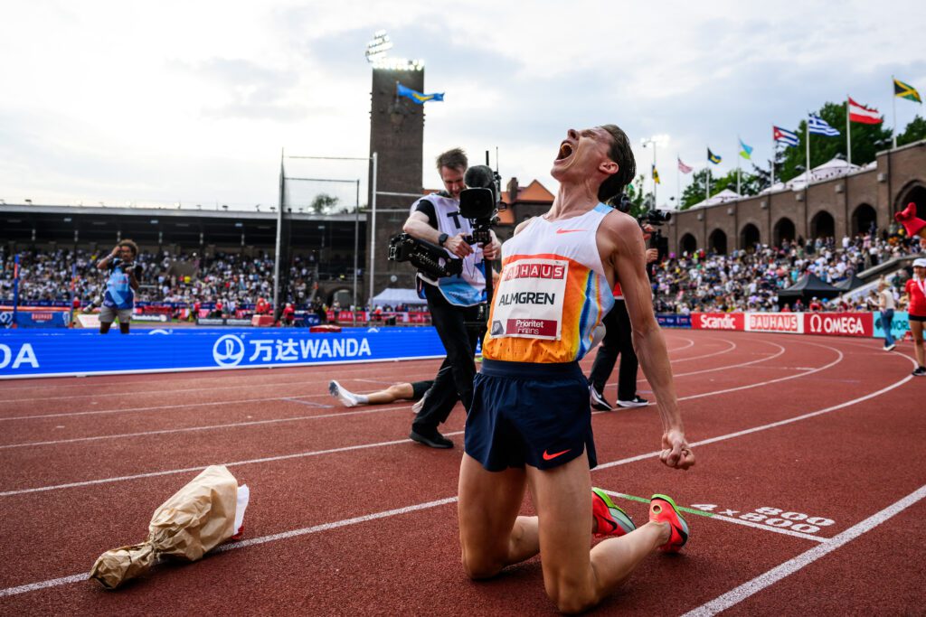 The crowd were already at fever pitch and when Mondo Duplantis set a new world record of 6.28m in the midst of Almgren’s race, it sent the excitement levels into the stratosphere. Feeding off the buoyant crowd, Almren set a relentless pace. He led the field through 3000m at 7:42.9. It was a pace even Olympic 1500m champion Cole Hocker could not live with.