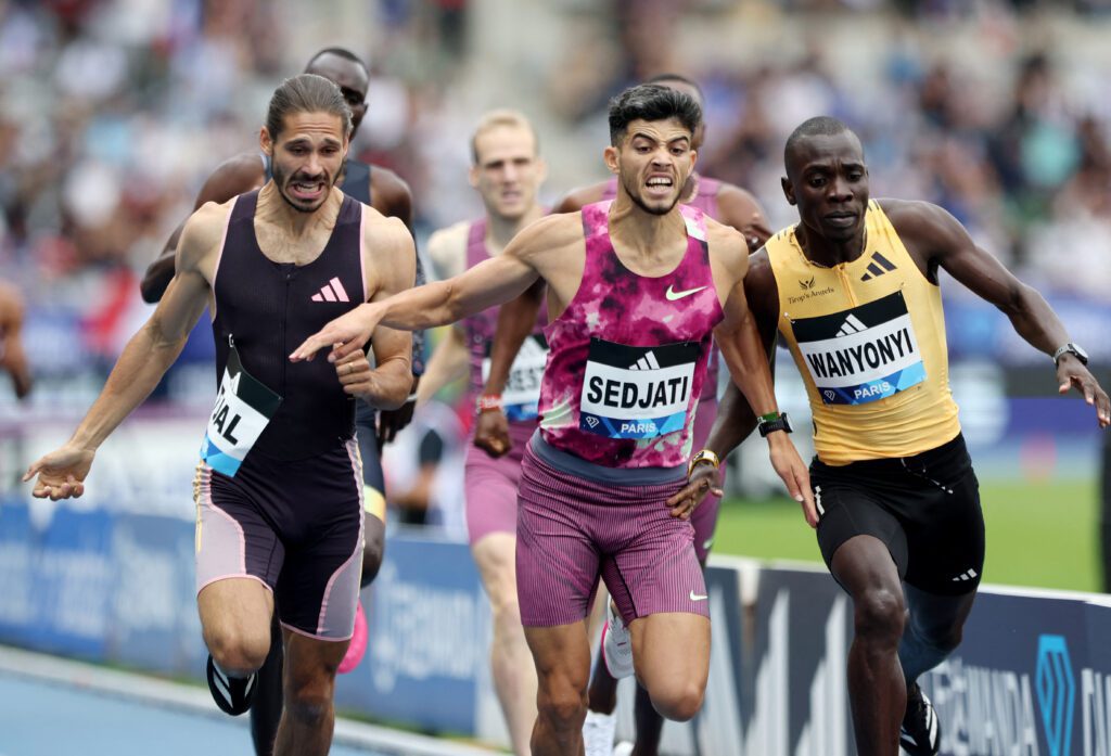 240707 Friidrott Athletics - Diamond League - Paris - Stade Charlety, Paris, France - July 7, 2024 France's Gabriel Tual, Algeria's Djamel Sedjati and Kenya's Emmanuel Wanyonyi in action during the men's 800m REUTERS/Manon Cruz © Bildbyrån - COP 7 - SWEDEN ONLY © Bildbyrån - COP 7 - SWEDEN ONLY